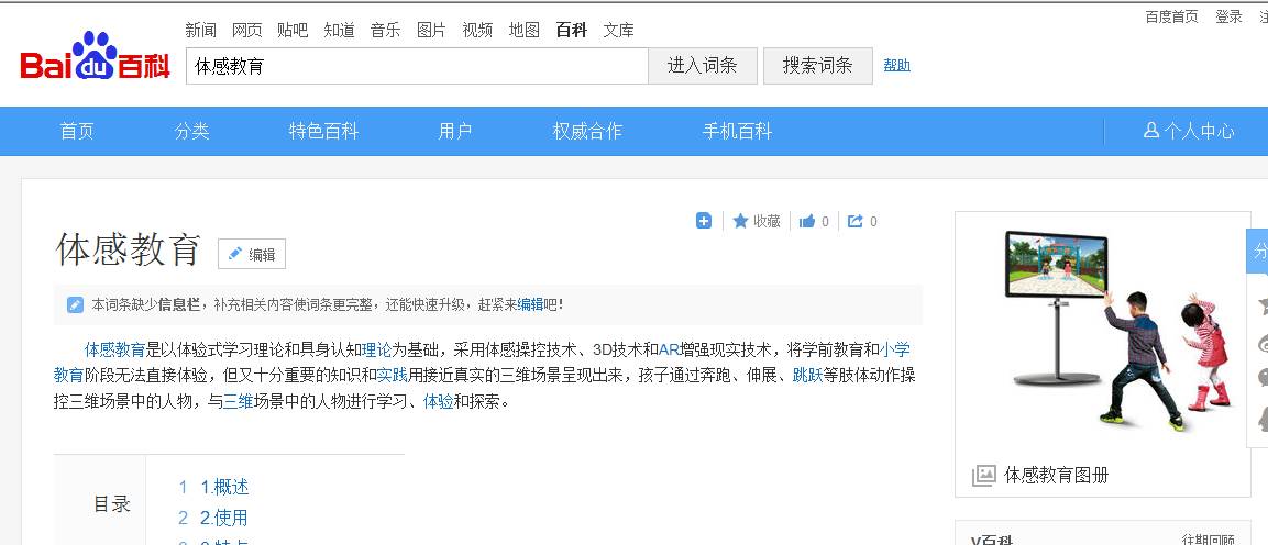 记者通过《百度百科》搜索,查到“体感教育”的名称解释如下:体感教育是以体验式学习理论和具身认知理论为基础,采用体感操控技术、3D技术和AR增强现实技术,将学前教育和小学教育阶段无法直接体验,但又十分重要的知识和实践用接近真实的三维场景呈现出来,孩子通过奔跑、伸展、跳跃等肢体动作操控三维场景中的人物,与三维场景中的人物进行学习、体验和探索。