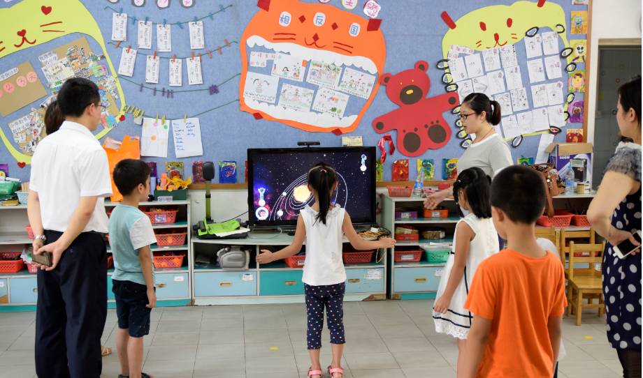 体感教育的技术原理,是通过体感摄像头采集和分析儿童的动作,并与画面中设定的情景和教学内容一一对应,儿童无需借助任何设备,只需要通过自身的肢体动作就可以凌空控制画面里的主角去参与各种教学游戏,培养孩子的好奇心和探索精神。
